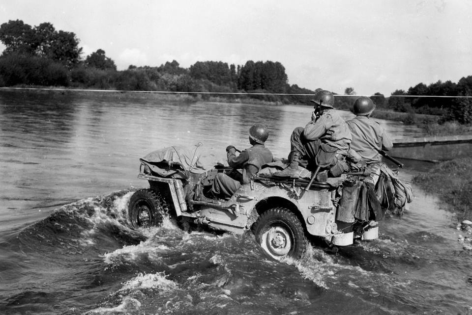45th Infantry Division’s 157th Regiment ford the Moselle River in a Willys Jeep, Fall 1944 near Igney, France
